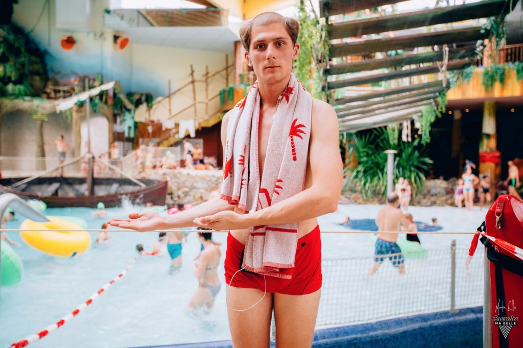 Chargé de ses machines, claviers, guitares et objets en tout genre, il s’installe au milieu des bassins. Les nageurs continuent leurs activités, d’autres, plus curieux, s’approchent à la nage. Jacques, lui, imperturbable, improvise un morceau en direct, bercé par le brouhaha ambiant. Equipé de son maillot de bain rouge moulant, de ses chaussons bleus protecteurs et de sa serviette de bain Quick, il fait utilise un à un ses instruments de fortune: plateau en métal, ciseaux, fouet de cuisine, boite de K7, élastique, saladier… tout y passé!