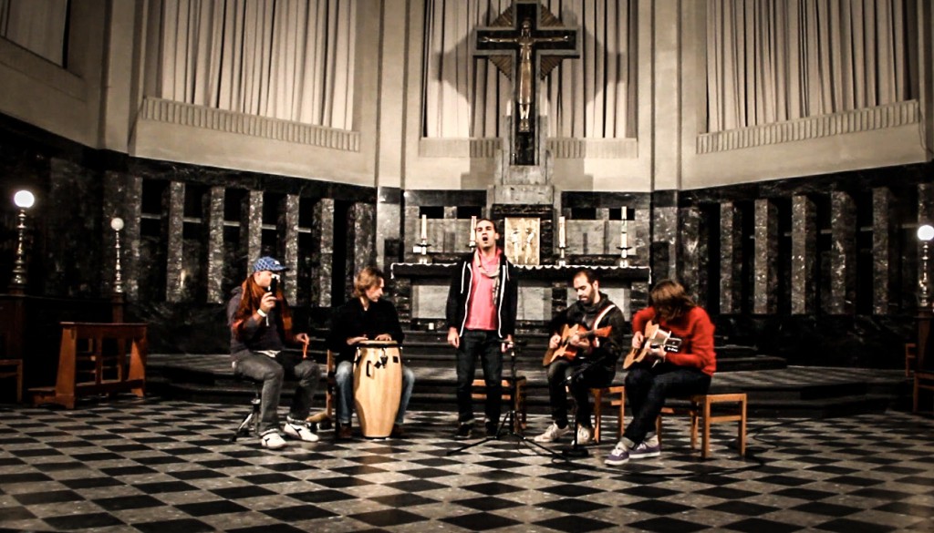 We’re there with Fool’s Gold,  five Americans from Los Angeles who just issued their album « Leave no Trace ».  They timidly move toward the altar, look at the surprising concrete structure and settle there.